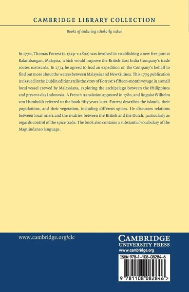 In 1770, Thomas Forrest (c.1729-c.1802) was involved in establishing a new free port at Balambangan, Malaysia, which would improve the British East India Company's trade routes eastwards. In 1774 he agreed to lead an expedition on the Company's behalf to find out more about the waters between Malaysia and New Guinea. This 1779 publication (reissued in the Dublin edition) tells the story of Forrest's fifteen-month voyage in a small local vessel crewed by Malaysians, exploring the archipelago between the Philippines and present-day Indonesia. A French translation appeared in 1780, and linguist Wilhelm von Humboldt referred to the book fifty years later. Forrest describes the islands, their populations, and their vegetation, including different spices. He discusses relations between local rulers, and the rivalries between the British and the Dutch, particularly as regards control of the spice trade. The book also contains a substantial vocabulary of the Maguindanao language.