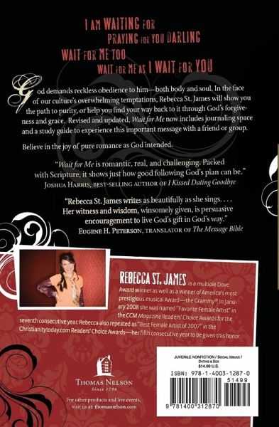 A call to young people to remain sexually pure until marriage. Everyone longs to be loved deeply by someone, and Rebecca St. James is no different, as demonstrated by her hit song "Wait for Me." In this revised and updated version of the 2002 release, Rebecca shares the same desires as other young people as her resolve to remain sexually pure until marriage is not common in our society. Using Scripture, pop culture, and her own experience as a point of reference, Rebecca paints a relevant and appealing picture of the value of waiting. But Rebecca also reaches out with compassion to those who have already made mistakes and reveals the mercy and healing that God brings. The new editon of this bestseller includes: a fresh design (inside and out) with eye-catching graphics; a new introduction from Rebecca; journaling sections throughout the book; and a study guide for personal or group use.
