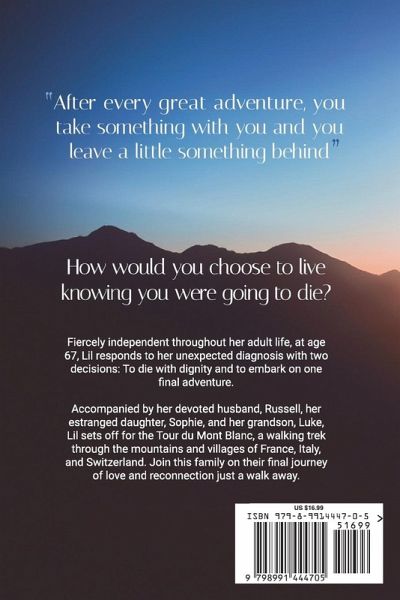 How would you choose to live knowing you were going to die? Fiercely independent throughout her adult life, at age 67, Lil responds to her unexpected diagnosis with two decisions: To die with dignity and to embark on one final adventure. Accompanied by her devoted husband, Russell, her estranged daughter, Sophie, and her grandson, Luke, Lil sets off for the Tour du Mont Blanc, a walking trek through the mountains and villages of France, Italy, and Switzerland. A keeper of secrets, Lil does not reveal her illness to her daughter and grandson. Nor does she disclose the full details of her plan to her husband. She also remains silent on why she selected this destination, a place she first visited long ago. Sophie and Luke carry secrets of their own, involving the death of Luke's father eighteen months ago. One evening on the Tour, Lil must confront her past after a conteur, a resident storyteller, recounts the fateful love of La Belle Elizabetta. As the miles pass, each family member wrestles with their unspoken truths and the cost of silence. "After every great adventure," Lil tells her reluctant grandson, "you take something with you and you leave a little something behind." Join this family on their final journey of love and reconnection just a walk away.