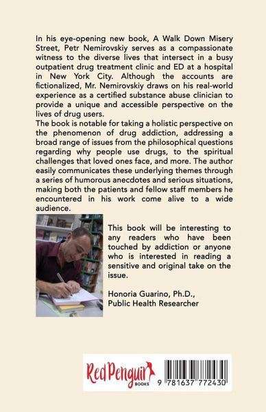 In his eye-opening new book, A Walk Down Misery Street, Petr Nemirovskiy serves as a compassionate witness to the diverse lives that intersect in a busy outpatient drug treatment clinic and ED of one of New York City's hospitals. Although the accounts are fictionalized, Mr. Nemirovskiy draws on his real-world experience as a certified substance abuse clinician to provide a unique and accessible perspective on the lives of drug users. The book is notable for taking a holistic perspective on the phenomenon of drug addiction, addressing a broad range of issues from the philosophical questions regarding why people use drugs, to the spiritual challenges that loved ones face, and more. The author easily communicates these underlying themes through a series of humorous anecdotes and serious situations, making both the patients and fellow staff members he encountered in his work come alive to a wide audience. The themes addressed in A Walk Down Misery Street are particularly relevant today, as the United States is experiencing an unprecedented crisis of opioid overdose. This book will be interesting to any readers who have been touched by addiction or anyone who is interested in reading a sensitive and original take on the issue.