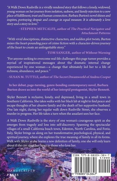 In her debut, page-turning, genre-bending contemporary novel, Barbara Burton draws us into the world of her intrepid protagonist Skyler Bennett. Skyler Bennett is reclusive, lonely, and depressed living in a small town in Southern California. She takes walks with her black lab at night to find peace and escape thoughts of her abusive family and the death of her supportive husband. One late night, during her regular walk down Rushville Street, she observes a murder in progress. Her life takes a turn when the assailant sees her face. A Walk Down Rushville is the story of one woman's courageous spirit as she emerges from tragedy and loss into self-discovery. Spanning the spectacular villages of a small California beach town, Edenton, North Carolina, and Forio, Italy, Skyler brings us along on her transformative psychological, physical, and spiritual journey, where she explores the true meaning of family in all its forms. Walk with Skyler as she learns a new definition of family, one she will only learn about if she can open her heart to those who love her.