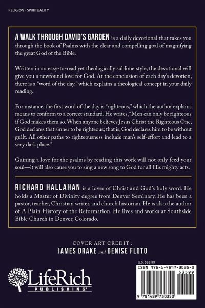 A Walk Through David's Garden is a daily devotional that takes you through the book of Psalms with the clear and compelling goal of magnifying the great God of the Bible. Written in an easy-to-read yet theologically sublime style, the devotional will give you a newfound love for God. At the conclusion of each day's devotion, there is a "word of the day," which explains a theological concept in your daily reading. For instance, the first word of the day is "righteous," which the author explains means to conform to a correct standard. He writes, "Men can only be righteous if God makes them so. When anyone believes Jesus Christ the Righteous One, God declares that sinner to be righteous; that is, God declares him to be without guilt. All other paths to righteousness include man's self-effort and lead to a very dark place." Gaining a love for the psalms by reading this work will not only feed your soul-it will also cause you to sing a new song to God for all His mighty acts.