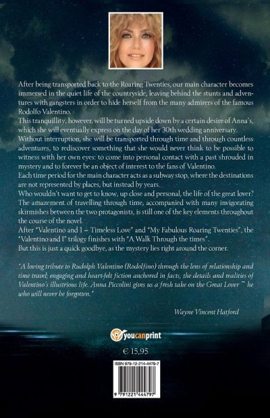 After being transported back to the Roaring Twenties, our main character becomes immersed in the quiet life of the countryside, leaving behind the stunts and adventures with gangsters in order to hide herself from the many admirers of the famous Rodolfo Valentino. This tranquillity, however, will be turned upside down by a certain desire of Anna's, which she will eventually express on the day of her 30th wedding anniversary. Without interruption, she will be transported through time and through countless adventures, to rediscover something that she would never think to be possible to witness with her own eyes: to come into personal contact with a past shrouded in mystery and to forever be an object of interest to the fans of Valentino. Each time period for the main character acts as a subway stop, where the destinations are not represented by places, but instead by years. Who wouldn't want to get to know, up close and personal, the life of the great lover? The amazement of travelling through time, accompanied with many invigorating skirmishes between the two protagonists, is still one of the key elements throughout the course of the novel. After "Valentino and I - Timeless Love" and "My Fabulous Roaring Twenties", the "Valentino and I" trilogy finishes with "Walking Through life". But this is just a quick goodbye, as the mystery lies right around the corner.