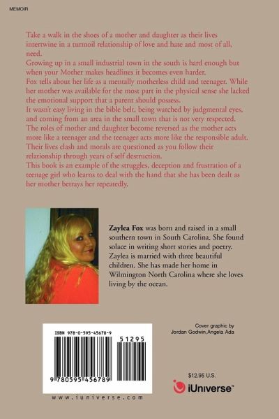 Take a walk in the shoes of a mother and daughter as their lives intertwine in a turmoil relationship of love and hate and most of all, need. Growing up in a small industrial town in the south is hard enough, but when your mother makes headlines as a murderer it is even harder. The author tells about her life as a mentally motherless child and teenager. While her mother was available for the most part in the physical sense she lacked the emotional support that a parent should possess. Imagine living in the bible belt, being watched by judgmental eyes, and coming from an area in the small town that is not very respected. The roles of mother and daughter become reversed as the mother acts more like a teenager and the teenager acts more like the responsible adult. Their lives clash and morals are questioned as you follow their relationship through years of self destruction. This book is an example of the struggles, deception and frustration of a teenage girl who learns to deal with the hand that she has been dealt as her mother betrays her repeatedly.