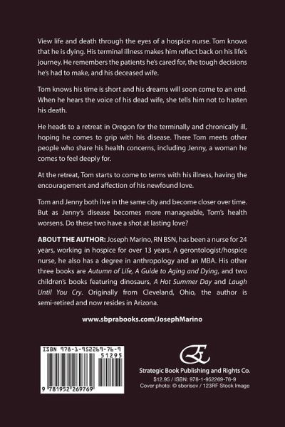 View life and death through the eyes of a hospice nurse. Tom knows that he is dying. His terminal illness makes him reflect back on his life's journey. He remembers the patients he's cared for, the tough decisions he's had to make, and his deceased wife. Tom knows his time is short and his dreams will soon come to an end. When he hears the voice of his dead wife, she tells him not to hasten his death. He heads to a retreat in Oregon for the terminally and chronically ill, hoping he comes to grip with his disease. There Tom meets other people who share his health concerns, including Jenny, a woman he comes to feel deeply for. At the retreat, Tom starts to come to terms with his illness, having the encouragement and affection of his newfound love. Tom and Jenny both live in the same city and become closer over time. But as Jenny's disease becomes more manageable, Tom's health worsens. Do these two have a shot at lasting love? About the Author: Joseph Marino, RN BSN, has been a nurse for 24 years, working in hospice for over 13 years. A gerontologist/hospice nurse, he also has a degree in anthropology and an MBA. His other three books are Autumn of Life, A Guide to Aging and Dying, and two children's books featuring dinosaurs, A Hot Summer Day and Laugh Until You Cry. Originally from Cleveland, Ohio, the author is semi-retired and now resides in Arizona.