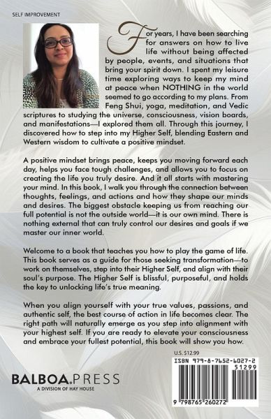 For years, I have been searching for answers on how to live life without being affected by people, events, and situations that bring your spirit down. I spent my leisure time exploring ways to keep my mind at peace when NOTHING in the world seemed to go according to my plans. From Feng Shui, yoga, meditation, and Vedic scriptures to studying the universe, consciousness, vision boards, and manifestations-I explored them all. Through this journey, I discovered how to step into my Higher Self, blending Eastern and Western wisdom to cultivate a positive mindset. A positive mindset brings peace, keeps you moving forward each day, helps you face tough challenges, and allows you to focus on creating the life you truly desire. And it all starts with mastering your mind. In this book, I walk you through the connection between thoughts, feelings, and actions and how they shape our minds and desires. The biggest obstacle keeping us from reaching our full potential is not the outside world-it is our own mind. There is nothing external that can truly control our desires and goals if we master our inner world. Welcome to a book that teaches you how to play the game of life. This book serves as a guide for those seeking transformation-to work on themselves, step into their Higher Self, and align with their soul's purpose. The Higher Self is blissful, purposeful, and holds the key to unlocking life's true meaning. When you align yourself with your true values, passions, and authentic self, the best course of action in life becomes clear. The right path will naturally emerge as you step into alignment with your highest self. If you are ready to elevate your consciousness and embrace your fullest potential, this book will show you how.