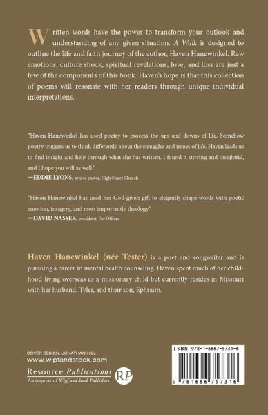 Written words have the power to transform your outlook and understanding of any given situation. A Walk is designed to outline the life and faith journey of the author, Haven Hanewinkel. Raw emotions, culture shock, spiritual revelations, love, and loss are just a few of the components of this book. Haven's hope is that this collection of poems will resonate with her readers through unique individual interpretations.