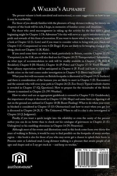 For those who need encouragement in taking up the pleasures of the long-distance footpath, a good beginning might be Chapter 1 ("A: Adventure"). If you want to know what to bring with you, look at Chapter 12 (L: Lists) and if you want to consider whom to bring with you, check out Chapter 3 (C: Companions), Chapter 11 (K: Kids) or even 4 (D: Dogs). If you need some hints on where to head, particularly in Britain, consider Chapter 22 (V: Viewpoints); in the U.K. you will also find use for Chapter 20 (T: Transportation), Chapter 2 (B: Bed & Breakfast), Chapter 8 (H: Hotels), Chapter 16 (P: Pubs), Chapter 25 (Y: Youth Hostels), Chapter 6 (F: Food) and Chapter 23: (W: Weather). How to cope with health crises is discussed in Chapter 9 (I: Illness and Injury). What your feet will encounter on British footpaths is illustrated in Chapter 19 (S: Surfaces); human encounters are discussed in Chapter 5 (E: Encounters) and animal ones in Chapter 26 (Z: Zoo Story). Typical trailside chatter is revealed in Chapter 17 (Q: Questions). How to select and use an appropriate guidebook is covered in Chapter 7 (G: Guidebooks), maps in Chapter 13 (M: Maps), and hints on figuring it all out on the ground in Chapter 18 (R: Route finding). What to do when your route in blocked is considered in Chapter 15 (O: Obstruction!), how to react when you get lost in Chapter 24 (X: X - The Unknown) and when to call it a day in Chapter 10 (J: Judgment). Finally, if you want a quick insight into the reliability or even the sanity of the present author, check out his catalogue of grievances in Chapter 21 (U: Unforgiven) or his rambling obsessions in Chapter 14 (N: Neurotica).