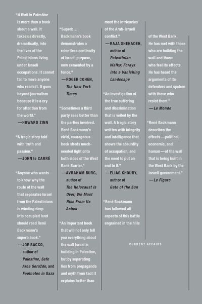 The West Bank Barrier is expected to be completed in 2010. Declared illegal by the United Nations International Court of Justice, this network of concrete walls, trenches, and barbed-wire fences could permanently redraw one of the most disputed property lines in the Middle East--the Green Line that separates Israel and the West Bank. To Israel the "security fence" is intended to keep Palestinian terrorists from entering its territory. But to Palestinians the "apartheid wall" that sliced through orchards and houses, and cuts off family members from one another, is a land grab. In this comprehensive book, Backmann not only addresses the barrier's impact on ordinary citizens, but how it will shape the future of the Middle East. Though it promises security to an Israeli population weary of terrorism, it also is responsible for the widespread destruction of Palestinian homes and farmland; with its Byzantine checkpoint regulations, it has also severely crippled the Palestinian economy; and, most urgent, the barrier often deviates from the Green Line, appropriating thousands of acres of land, effectively redrawing the boundary between the West Bank and Israel. Backmann interviews Israeli policy makers, politicians, and military personnel, as well as Palestinians living throughout the West Bank, telling the stories not only of the barrier's architects, but also of those who must reckon with it on a day-to-day basis on the ground. With bold, brilliant, and often impassioned reportage, A Wall in Palestine renders the West Bank Barrier--its purpose, its efficacy, its consequences--as no book before.