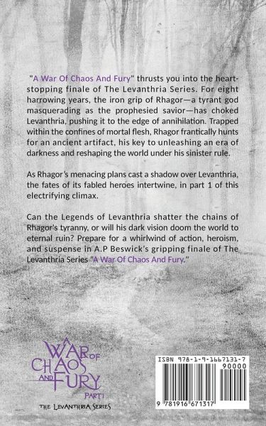 "A War Of Chaos And Fury" thrusts you into the heart-stopping finale of The Levanthria Series. For eight harrowing years, the iron grip of Rhagor-a tyrant god masquerading as the prophesied savior-has choked Levanthria, pushing it to the edge of annihilation. Trapped within the confines of mortal flesh, Rhagor frantically hunts for an ancient artifact, his key to unleashing an era of darkness and reshaping the world under his sinister rule. As Rhagor's menacing plans cast a shadow over Levanthria, the fates of its fabled heroes intertwine, in part 1 of this electrifying climax. Can the Legends of Levanthria shatter the chains of Rhagor's tyranny, or will his dark vision doom the world to eternal ruin? Prepare for a whirlwind of action, heroism, and suspense in A.P Beswick's gripping finale of The Levanthria Series "A War Of Chaos And Fury."