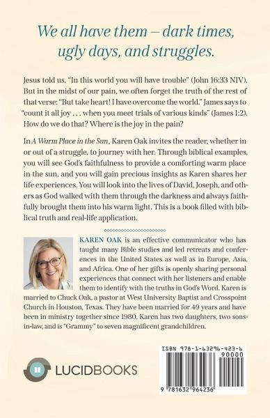 We all have them - dark times, ugly days, and struggles. Jesus told us, "In this world you will have trouble" (John 16:33 NIV). But in the midst of our pain, we often forget the truth of the rest of that verse: "But take heart! I have overcome the world." James says to "count it all joy...when you meet trials of various kinds" (James 1:2). How do we do that? Where is the joy in the pain? In A Warm Place in the Sun, Karen Oak invites the reader, whether in or out of a struggle, to journey with her. Through biblical examples, you will see God's faithfulness to provide a comforting warm place in the sun, and you will gain precious insights as Karen shares her life experiences. You will look into the lives of David, Joseph, and others as God walked with them through the darkness and always faithfully brought them into his warm light. This is a book filled with biblical truth and real-life application.