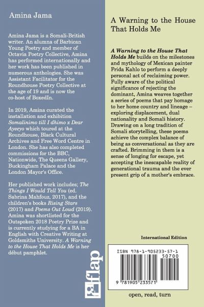A Warning to the House That Holds Me builds on the milestones and mythology of Mexican painter Frida Kahlo to perform a deeply personal act of reclaiming power. Fully aware of the political significance of rejecting the dominant, Amina weaves together a series of poems that pay homage to her home country and lineage - exploring displacement, dual nationality and Somali history. Drawing on a long tradition of Somali storytelling, these poems achieve the complex balance of being as conversational as they are crafted. Brimming in them is a sense of longing for escape, yet accepting the inescapable reality of generational trauma and the ever present grip of a mother's embrace.