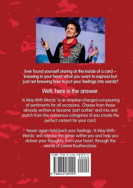 Ever found yourself staring at the inside of a card - knowing in your heart what you want to express but just not knowing how to put your feelings into words? Well, here is the answer. 'A Way With Words' is an emotion-charged out-pouring of sentiments for all occasions. Choose from those already written or become 'part author' and mix and match from the numerous categories til you create the perfect content for your card. Never again hold back your feelings. 'A Way With Words' will release the genie within you and help you deliver your thoughts, from your heart, through the words of Leonie Featherstone.