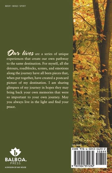 Our lives are a series of unique experiences that create our own pathway to the same destination. For myself, all the detours, roadblocks, scenes, and emotions along the journey have all been pieces that, when put together, have created a postcard picture of my destination. I am sharing glimpses of my journey in hopes they may bring back your own memories that were so important to your own journey. May you always live in the light and find your peace.