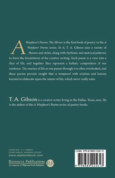 A Wayfarer's Poems: The Mirror is the first book of poetry in the A Wayfarer Poems series. In it, T. A. Gibson uses a variety of themes and styles, along with rhythmic and metrical patterns, to form the foundations of his creative writing. Each poem is a view into a slice of life, and together they represent a holistic composition of our existence. The essence of life as one passes through it is often overlooked, and these poems provide insight that is tempered with wisdom and lessons learned to elaborate upon the nature of life, which never really ends.