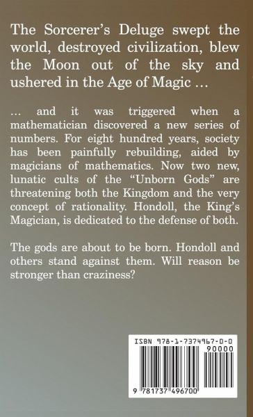 The Sorcerer's Deluge swept the world, destroyed civilization, blew the Moon out of the sky and ushered in the Age of Magic. It was triggered when a mathematician discovered a new series of numbers. Like negative, irrational and imaginary numbers, "commotic" numbers seem like purely mental constructions but turn out to describe the real world. Unlike the others, expressions written with magical or "commotic" numbers also directly affect the world, by changing the relationships between things and places. Used ignorantly, mathematical magic leveled cities, brought down fire from the skies and killed millions. But a mathematician trained in magic can bring needed rain, heal wounds, travel instantly between places and use spells to do a hundred other useful things. For eight hundred years, society has been painfully rebuilding, aided by magicians of mathematics. There are two new, lunatic cults gaining power in the Kingdom, each crazier than the other. They worship the "Unborn Gods," one repressed and puritanical, the others Dionysian and drunk. They threaten the Kingdom, and more importantly, they threaten the very concept of rationality. Hondoll, the King's Magician, is charged with standing against them. He has a few allies and many enemies. Will reason and courage be stronger than craziness?