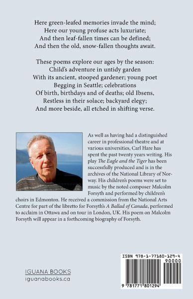 Here green-leafed memories invade the mind; Here our young profuse acts luxuriate; And then leaf-fallen times can be defined; And then the old, snow-fallen thoughts await. These poems explore our ages by the season: Child's adventure in untidy garden With its ancient, stooped gardener; young poet Begging in Seattle; celebrations Of birth, birthdays and of deaths; old Ibsens, Restless in their solace; backyard elegy; And more beside, all etched in shifting verse.