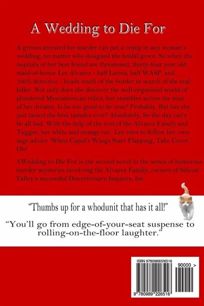A groom arrested for murder can put a crimp in anybody's wedding, no matter who designed the bridal gown. So when the nuptials of her best friend are threatened, maid-of-honor Lee Alvarez -- the thirty-four-year old combination of Sue Grafton's Kinsey Millhone and Janet Evanovitch's Stephanie Plum - heads south of the border in search of the real killer. Not only does this half Latina, half WASP, and 100% detective discover the well-organized world of plundered Mesoamerican relics, but stumbles across the man of her dreams. Is he too good to be true? Probably. But has she just tasted the best tamales ever? Absolutely. So the day can't be all bad. With the help of the rest of the Alvarez Family, Never-Had-A-Bad-Hair-Day blueblood mother, Lila Hamilton Alvarez, brother and computer genius, Richard; favorite uncle, "Tío" Mateo; and Tugger, her energetic orange and white cat, Lee tries to follow her own sage advice, 'When Cupid's wings start flapping, take cover' because love and murder can't be far behind. Olé! A Wedding To Die For is the second novel in a series of humorous murder mysteries involving the Alvarez Family, owners of Silicon Valley's successful Discretionary Inquiries.