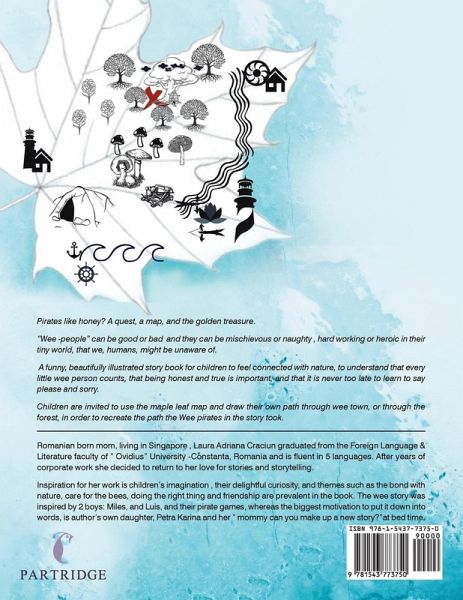 Pirates like honey? A quest, a map, and the golden treasure. "Wee -people" can be good or bad and they can be mischievous or naughty , hard working or heroic in their tiny world, that we, humans, might be unaware of. A funny, beautifully illustrated story book for children to feel connected with nature, to understand that every little wee person counts, that being honest and true is important, and that it is never too late to learn to say please and sorry. Children are invited to use the maple leaf map and draw their own path through wee town, or through the forest, in order to recreate the path the Wee pirates in the story took.