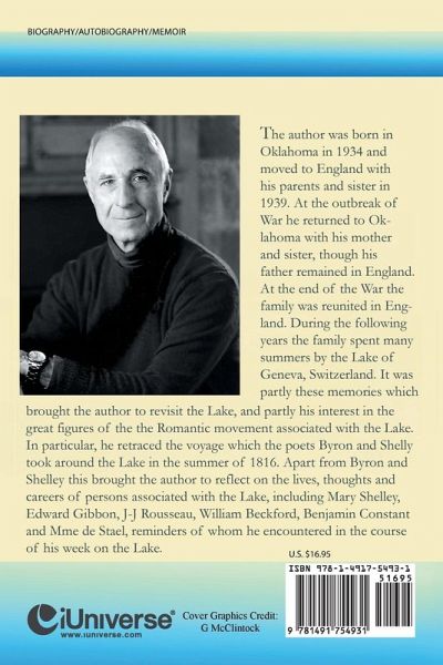 The author was born in Oklahoma in 1934 and moved to England with his parents and sister in 1939. At the outbreak of War he returned to Oklahoma with his mother and sister, though his father remained in England. At the end of the War the family was reunited in England. During the following years the family spent many summers by the Lake of Geneva, Switzerland. It was partly these memories which brought the author to revisit the Lake, and partly his interest in the great figures of the Romantic movement associated with the Lake. In particular, he retraced the voyage which the poets Byron and Shelley took around the Lake in the summer of 1816. Apart from Byron and Shelley this brought the author to reflect on the lives, thought and careers of other persons associated with the Lake, including Mary Shelley, Edward Gibbon, J-J Rousseau, William Beckford, Benjamin Constant and Mme de Stael, reminders of whom he encountered in the course of his week on the Lake.