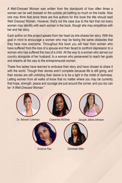 A Well Dressed Woman was written from the standpoint of how often times a woman can be well dressed on the outside yet battling so much on the inside. Now one may think that since there are four authors for this book the title should read A Well Dressed Women. However, that's not the case due to the fact that not every woman may identify with each woman in the book, though she may empathize with her and her story. Each author on this project speaks from her heart as she shares her story. With the goal in mind to encourage a woman who may be facing the same obstacles that they have now overcome. Throughout this book you will hear from women who have suffered from the loss of a spouse and then faced to confront depression to a woman who has suffered the loss of a child. All they way to a who serves our country alongside of her husband, to a woman who persevered to reach her goals and dreams all the way to the entrepreneurial woman. These five ladies have learned to embrace their story and have chosen to share it with the world. Though their stories aren't complete because life is still going and their stories are still unfolding their desire is to be a light in the midst of darkness. Letting women from all walks of know that no matter where you may be currently that hope, strength, peace and courage are just around the corner and you too can be " A Well Dressed Woman."
