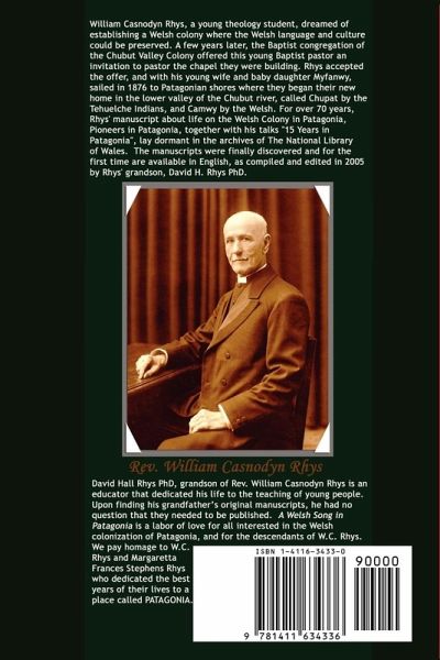 William Casnodyn Rhys, a young theology student, dreamed of establishing a Welsh colony where the Welsh language and culture could be preserved. A few years later, the Baptist congregation of the Chubut Valley Colony offered this young pastor of the Baptist Congregation of Swansea, Wales, an invitation to pastor the chapel they were building. Rhys accepted the offer, and with his young wife and baby daughter Myfanwy, sailed in 1876 to Patagonian shores where they began their new home in the lower valley of the Chubut river, called Chupat by the Tehuelche Indians, and Camwy by the Welsh. For over 70 years, Rhys' manuscript about life on the Welsh Colony in Patagonia, Pioneers in Patagonia, together with the talks "15 Years in Patagonia", lay dormant in the archives of The National Library of Wales. The manuscripts were finally discovered and for the first time are available in English, as compiled in 2005 by Rhys' grandson, David H. Rhys Ph.D.