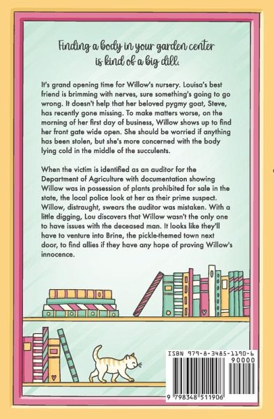 Finding a body in your garden center is kind of a big dill. It's grand opening time for Willow's nursery. Louisa's best friend is brimming with nerves, sure something's going to go wrong. It doesn't help that her beloved pygmy goat, Steve, has recently gone missing. To make matters worse, on the morning of her first day of business, Willow shows up to find her front gate wide open. She should be worried if anything has been stolen, but she's more concerned with the body lying cold in the middle of the succulents. When the victim is identified as an auditor for the Department of Agriculture with documentation showing Willow was in possession of plants prohibited for sale in the state, the local police look at her as their prime suspect. Willow, distraught, swears the auditor was mistaken. With a little digging, Lou discovers that Willow wasn't the only one to have issues with the deceased man. It looks like they'll have to venture into Brine, the pickle-themed town next door, to find allies if they have any hope of proving Willow's innocence. Dear reader, if you love rescue cats, goats who wear pajamas, and a cozy bookstore, you're going to love this series by Eryn Scott. Hold on to your hats. The town of Button is as cute as they come, but that doesn't mean it's free of murder. Each book and mystery stands alone. Curl up under a cozy blanket, cuddle with a cat (or two), and come join Lou as she solves mysteries in the town of Button.