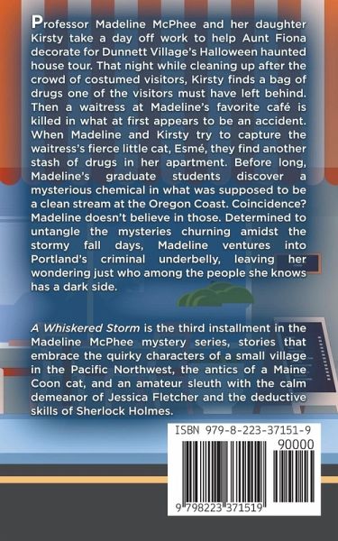Professor Madeline McPhee and her daughter Kirsty take a day off work to help Aunt Fiona decorate for Dunnett Village's Halloween haunted house tour. That night while cleaning up after the crowd of costumed visitors, Kirsty finds a bag of drugs one of the visitors must have left behind. Then a waitress at Madeline's favorite café is killed in what at first appears to be an accident. When Madeline and Kirsty try to capture the waitress's fierce little cat, Esmé, they find another stash of drugs in her apartment. Before long, Madeline's graduate students discover a mysterious chemical in what was supposed to be a clean stream at the Oregon Coast. Coincidence? Madeline doesn't believe in those. Determined to untangle the mysteries churning amidst the stormy fall days, Madeline ventures into Portland's criminal underbelly, leaving her wondering just who among the people she knows has a dark side. A Whiskered Storm is the third installment in the Madeline McPhee mystery series, stories that embrace the quirky characters of a small village in the Pacific Northwest, the antics of a Maine Coon cat, and an amateur sleuth with the calm demeanor of Jessica Fletcher and the deductive skills of Sherlock Holmes.