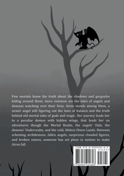Few mortals know the truth about the shadows and gargoyles hiding around them; more common are the tales of angels and demons watching over their lives. Airen stands among them, a newer angel still figuring out the laws of balance and the truth behind old mortal tales of gods and magic. Her journey leads her to a peculiar demon with hidden wings, that leads her on adventures though the Mortal Realm, the angels' Halo, the demons' Underrealm, and the cold, lifeless Omen Lands. Between scheming archdemons, fallen angels, suspicious clouded figures, and broken omens, someone has set plans in motion to make Airen fall.