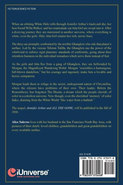 When an orbiting White Hole rolls through Jennifer Arthur's backyard she, her best friend Willa Walker, and her marmalade cat Atta Girl are swept into it. After a dizzying journey they are marooned in a universe, where everything is white, even the girls. Only Atta Girl retains her rich, tawny hues. The three are promptly confronted by the terrible Ghanglers who rule that planet's surface. Led by the vicious Tehrran Tuhlla, the Ghanglers use the power of the whirlwind to enforce rigid planetary standards of conformity as they go about their relentless business on the individual tornadoes which serve them instead of feet. As the girls and Atta flee from a gang of Ghanglers, they are befriended by Morgan, the Magnificent Wandering Wohtt. Morgan 'resembles a humungous, full-blown dandelion," but his courage and ingenuity make him a lovable and heroic companion. Morgan leads them to refuge in the secret, underground nation of Chrystellea, where the citizens have problems of their own. Their leader, Behrrn the Rememberer, has forgotten The Dream, a dream which the people cherish, of color in a colorless universe. Now though, even the cherished 'memory' of color fades, draining from the White World 'like water from a bathtub." The sequel, Jenny and the Dread Dimension, will be published in the fall of 2006.