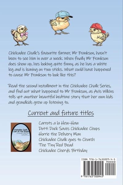 Chickadee Chalk is back for another bedtime story! And something has happened to his favorite farmer Mr Frankson. Every day, Mr Frankson comes and visits Chickadee Chalk and his family, whether it is to just say hello or to watch his little chickadee chickens play. But one day, Mr Frankson didn't show up! A whole week went by, and there was no Mr Frankson. Where could he be? Find out what happened to Mr Frankson in 'A White Leg and Two Sticks', the second book in the Chickadee Chalk Series.