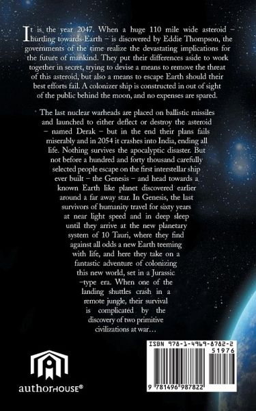 It is the year 2047. When a huge 110 mile wide asteroid - hurtling towards Earth - is discovered by Eddie Thompson, the governments of the time realize the devastating implications for the future of mankind. They put their differences aside to work together in secret, trying to devise a means to remove the threat of this asteroid, but also a means to escape Earth should their best efforts fail. A colonizer ship is constructed in out of sight of the public behind the moon, and no expenses are spared. The last nuclear warheads are placed on ballistic missiles and launched to either deflect or destroy the asteroid - named Derak - but in the end their plans fails miserably and in 2054 it crashes into India, ending all life. Nothing survives the apocalyptic disaster. But not before a hundred and forty thousand carefully selected people escape on the first interstellar ship ever built - the Genesis - and head towards a known Earth like planet discovered earlier around a far away star. In Genesis, the last survivors of humanity travel for sixty years at near light speed and in deep sleep until they arrive at the new planetary system of 10 Tauri, where they find against all odds a new Earth teeming with life, and here they take on a fantastic adventure of colonizing this new world, set in a Jurassic -type era. When one of the landing shuttles crash in a remote jungle, their survival is complicated by the discovery of two primitive civilizations at war...