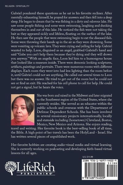 Gabriel pondered these questions as he sat in his favorite recliner. After mentally exhausting himself, he prayed for answers and then fell into a deep sleep. He began to dream that he was fishing in a dirty and odorous lake. He saw some people fishing and some were swimming, laughing and dunking themselves in and out of this lake. He noticed the fish were not taking the bait as they appeared sickly and lifeless, floating on the surface of the lake. He then saw the people that were swimming begin to eat the diseased fish. Some were throwing their hands up in the air as they were drowning. Some were vomiting up volcanic lava. They were crying and yelling for help. Gabriel wanted to help. Leon, disguised as an angel, grabbed Gabriel's hand and said "Gabe you can't help them because they're dying and they will drown you anyway." With an angelic face, Leon led him to a humongous house that looked like a museum inside. There were demonic looking sculptures, artifacts, paintings and portraits. There were numerous rooms with different displays. Each room they went into had less lighting than the room before it, until Gabriel could not see anything. He called out several times to Leon but there was no answer. He tried to get out of the room but he could not see or find an exit. He reached for his cell phone to call for help. He could not get a signal, but he hears the voice.
