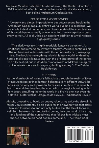 As the aftershocks of Kalinor's fall radiate through the realm of Ilyar, Prince Jonas Belgi finds himself fighting a very different war. As he battles for his very soul, powerful forces are in motion to remove him from the world entirely, lest the contradictory magics burning within him engulf all of existence in a conflagration that no one, not even his beloved Hunter Aleksei Drago, could hope to survive. Even as Jonas begins the impossible task of escaping his prison, the Lord Captain is caught up in a savage civil war. As the fractured remnants of the Legions attempt to regroup, seeking refuge from the hordes of rebel soldiers dogging their every step, Aleksei is confronted by a new nemesis, a creature at once invisible and indestructible. Aleksei must be constantly vigilant for the vengeful spirit that stalks him, waiting to catch him off-guard, thus forfeiting both his and Jonas's lives. Aleksei is torn between his need to find Jonas and commanding the last remnant of the Legion against the Zra-Uul's rebellion, with its overwhelming numbers and scores of powerful and destructive Magi under the Demon Bael's command. Having to chose between his heart and his homeland, Aleksei attempts to accomplish the impossible, while always listening for a wind. A Wicked Wind.