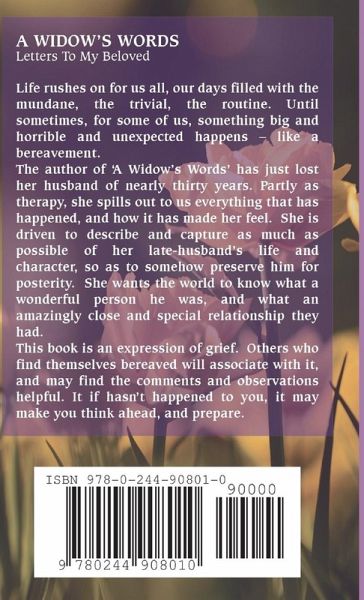 Life rushes on for us all, our days filled with the mundane, the trivial, the routine. Until sometimes, for some of us, something big and horrible and unexpected happens - like a bereavement. The author of 'A Widow's Words' has just lost her husband of nearly thirty years. Partly as therapy, she spills out to us everything that has happened, and how it has made her feel. She is driven to describe and capture as much as possible of her late-husband's life and character, so as to somehow preserve him for posterity. She wants the world to know what a wonderful person he was, and what an amazingly close and special relationship they had. This book is an expression of grief. Others who find themselves bereaved will associate with it, and may find the comments and observations helpful. It if hasn't happened to you, it may make you think ahead, and prepare.