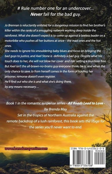 # Rule number one for an undercover... Never fall for the bad guy. Jo Brennan is reluctantly enlisted for a dangerous mission to find her brother's killer within the ranks of a smuggling network working deep inside the rainforest. What she doesn't expect is to come up against a lawless leader on a motorbike who pushes all her buttons at once - the mad ones and the hot ones She needs to ignore his smouldering baby blues and focus on bringing the bad guys to justice, and Axel Stone is definitely a bad guy. Despite what his touch does to her, she will not blow her cover risk and setting a murderer free. But Axel isn't the all-brawn-no-brains guy everyone thinks he is, and when the only chance to save Jo from herself comes in the form of holding her prisoner, remorse doesn't even register. He'll find out who she is and what she's doing there, by any means necessary... Book 1 in the romantic suspense series - All Roads Lead to Love by Brenda May - set in the tropics of Northern Australia against the remote backdrop of a lush rainforest.