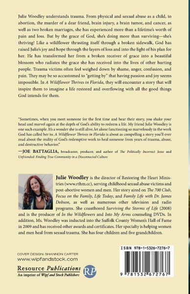 Julie Woodley understands trauma. From physical and sexual abuse as a child, to abortion, the murder of a dear friend, brain injury, a brain tumor, and cancer, as well as two broken marriages, she has experienced more than a lifetime's worth of pain and loss. But by the grace of God, she's doing more than surviving--she's thriving! Like a wildflower thrusting itself through a broken sidewalk, God has raised Julie's joy and hope through the layers of loss and into the light of his plan for her. He has transformed her from a broken receiver of grace into a beautiful blossom who radiates the grace she has received into the lives of other hurting people. Trauma victims often feel weighed down by shame, anger, confusion, and pain. They may be so accustomed to ""getting by"" that having passion and joy seems impossible. In A Wildflower Thrives in Florida, they will encounter a story that will inspire them to imagine a life restored and overflowing with all the good things God intends for them. ""Sometimes, when you meet someone for the first time and hear their story, you shake your head and marvel again at the depth of God's ability to redeem a life. My friend Julie Woodley is one such example. It's a wonder she is still alive, let alone functioning so marvelously in the work God has called her to. A Wildflower Thrives in Florida is about as compelling a story you'll ever read about the reality of God's redemptive work to heal someone from years of trauma, abuse, and destructive behavior."" --Joe Battaglia, broadcaster, producer, and author of The Politically Incorrect Jesus and Unfriended: Finding True Community in a Disconnected Culture Julie Woodley is the director of Restoring the Heart Ministries (www.rthm.cc), serving childhood sexual abuse victims and post-abortive women and men. Her story aired on The 700 Club, Focus on the Family, Life Today, and Family Life with Dr. James Dobson, as well as numerous other television and radio programs. She coauthored Surviving the Storms of Life (2008) and is the producer of In the Wildflowers and Into My Arms counseling DVDs. In addition, Ms. Woodley was inducted into the Suffolk County Women's Hall of Fame in 2009 and has received other awards and certificates. Her specialty is helping women and men heal from sexual trauma. She has four children and five grandchildren.