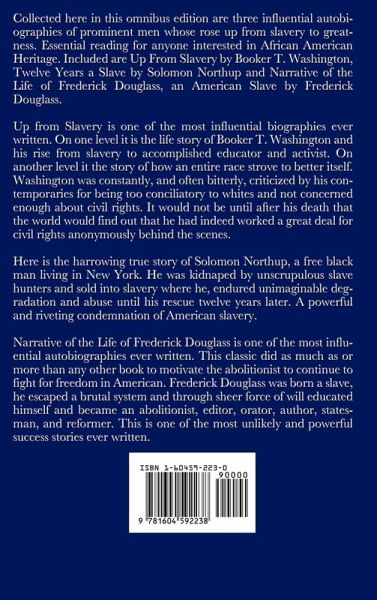 Collected here in this omnibus edition are three influential autobiographies of prominent men whose rose up from slavery to greatness. Essential reading for anyone interested in African American Heritage. Included are Up From Slavery by Booker T. Washington, Twelve Years a Slave by Solomon Northup and Narrative of the Life of Frederick Douglass, an American Slave by Frederick Douglass. Up from Slavery is one of the most influential biographies ever written. On one level it is the life story of Booker T. Washington and his rise from slavery to accomplished educator and activist. On another level it the story of how an entire race strove to better itself. Washington was constantly, and often bitterly, criticized by his contemporaries for being too conciliatory to whites and not concerned enough about civil rights. It would not be until after his death that the world would find out that he had indeed worked a great deal for civil rights anonymously behind the scenes. Twelve Years a Slave is the harrowing true story of Solomon Northup, a free black man living in New York. He was kidnaped by unscrupulous slave hunters and sold into slavery where he, endured unimaginable degradation and abuse until his rescue twelve years later. A powerful and riveting condemnation of American slavery. Narrative of the Life of Frederick Douglass is one of the most influential autobiographies ever written. This classic did as much as or more than any other book to motivate the abolitionist to continue to fight for freedom in American. Frederick Douglass was born a slave, he escaped a brutal system and through sheer force of will educated himself and became an abolitionist, editor, orator, author, statesman, and reformer. This is one of the most unlikely and powerful success stories ever written.