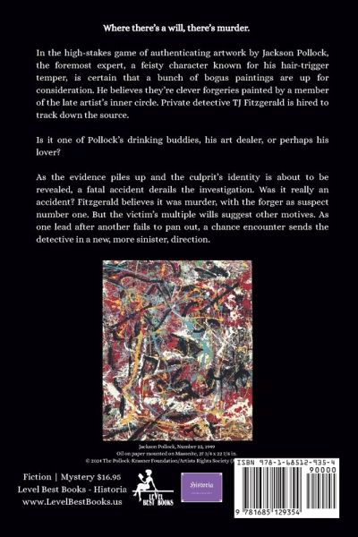 Where there's a will, there's murder. In the high-stakes game of authenticating artwork by Jackson Pollock, the foremost expert, a feisty character known for his hair-trigger temper, is certain that a bunch of bogus paintings are up for consideration. He believes they're clever forgeries painted by a member of the late artist's inner circle. Private detective TJ Fitzgerald is hired to track down the source. Is it one of Pollock's drinking buddies, his art dealer, or perhaps his lover? As the evidence piles up and the culprit's identity is about to be revealed, a fatal accident derails the investigation. Was it really an accident? Fitzgerald believes it was murder, with the forger as suspect number one. But the victim's multiple wills suggest other motives. As one lead after another fails to pan out, a chance encounter sends the detective in a new, more sinister, direction.