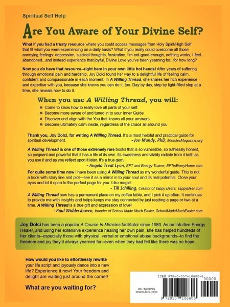 Are You Aware of Your Divine Self? What if you had a trusty resource where you could access messages from Holy Spirit/High Self that fit what you were experiencing on a daily basis? What if you really could overcome all those annoying feelings: depression, suicidal thoughts, frustration, I'm-not-good-enough, nothing works, I-feel-abandoned...and instead experience that joyful, Divine Love you've been yearning for...for how long? Now you do have that resource--right here in your own little hot hands! After years of suffering through emotional pain and hardship, Joy Dolci found her way to a delightful life of feeling calm, confident and compassionate in each moment. In A Willing Thread, she shares her rich experience and expertise with you, because she knows you can do it, too. Day by day, step by light-filled step at a time, she reveals how to do it.