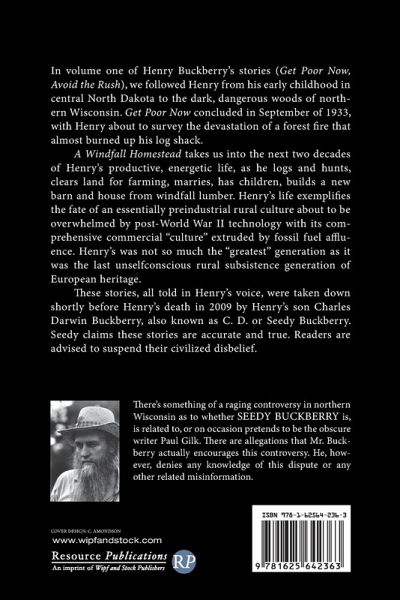In volume one of Henry Buckberry's stories (Get Poor Now, Avoid the Rush), we followed Henry from his early childhood in central North Dakota to the dark, dangerous woods of northern Wisconsin. Get Poor Now concluded in September of 1933, with Henry about to survey the devastation of a forest fire that almost burned up his log shack. A Windfall Homestead takes us into the next two decades of Henry's productive, energetic life, as he logs and hunts, clears land for farming, marries, has children, builds a new barn and house from windfall lumber. Henry's life exemplifies the fate of an essentially preindustrial rural culture about to be overwhelmed by post-World War II technology with its comprehensive commercial ""culture"" extruded by fossil fuel affluence. Henry's was not so much the ""greatest"" generation as it was the last unself-conscious rural subsistence generation of European heritage. These stories, all told in Henry's voice, were taken down shortly before Henry's death in 2009 by Henry's son Charles Darwin Buckberry, also known as C. D. or Seedy Buckberry. Seedy claims these stories are accurate and true. Readers are advised to suspend their civilized disbelief.