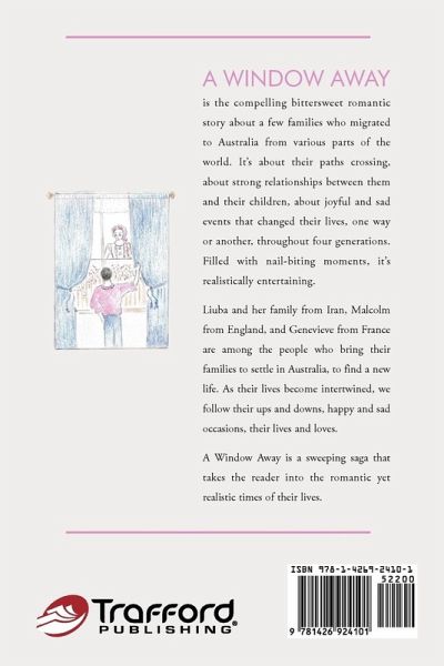 A Window Away is the compelling bittersweet romantic story about a few families who migrated to Australia from various parts of the world. It's about their paths crossing, about strong relationships between them and their children, about joyful and sad events that changed their lives, one way or another, throughout four generations. Filled with nail-biting moments, it's realistically entertaining. Liuba and her family from Iran, Malcolm from England, and Genevieve from France are among the people who bring their families to settle in Australia, to find a new life. As their lives become intertwined, we follow their ups and downs, happy and sad occasions, their lives and loves. A Window Away is a sweeping saga that takes the reader into the romantic yet realistic times of their lives.