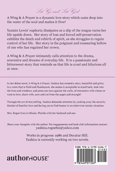 A Wing & A Prayer is a dynamic love story which casts deep into the water of the soul and makes it flow! Yazmin Lewis' euphoria dissipates as a slip of the tongue turns her life upside down. Her story of loss and forced self-preservation exhibits the death and rebirth of spirit, as she struggles to regain control of her life. Her story is the poignant and reassuring bellow of one who has regained her crown. A Wing & A Prayer intimately calls attention to the drama, souvenirs and dreams of everyday life. It is a passionate and bittersweet story that reminds us that life is cruel and hilarious all at once.