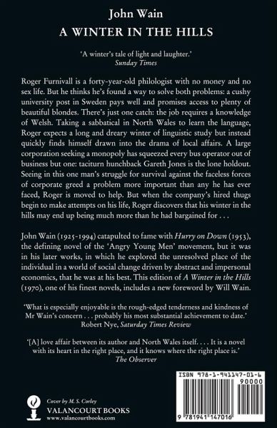 '[A] triumph of mature observation and art.' - Daily Telegraph 'A winter's tale of light and laughter.' - Sunday Times 'What is especially enjoyable is the rough-edged tenderness and kindness of Mr Wain's concern ... probably his most substantial achievement to date.' - Robert Nye, Saturday Times Review '[S]ubstantial and serious ... sustains a vigorous narrative line - he has always been an excellent storyteller.' - Times Literary Supplement '[A] love affair between its author and North Wales itself.... It is a novel with its heart in the right place, and it knows where the right place is.' - The Observer 'Clever and entertaining.' - The Guardian Roger Furnivall is a forty-year-old philologist with no money and no sex life. But he thinks he's found a way to solve both problems: a cushy university post in Sweden pays well and promises access to plenty of beautiful blondes. There's just one catch: the job requires a knowledge of Welsh. Taking a sabbatical in North Wales to learn the language, Roger expects a long and dreary winter of linguistic study, but instead quickly finds himself drawn into the drama of local affairs. A large corporation seeking a monopoly has squeezed every bus operator out of business but one: taciturn hunchback Gareth Jones is the lone holdout. Seeing in this one man's struggle for survival against the faceless forces of corporate greed a problem more important than any he has ever faced, Roger is moved to help. But when the company's hired thugs begin to make attempts on his life, Roger discovers that his winter in the hills may end up being much more than he had bargained for ... John Wain (1925-1994) catapulted to fame with Hurry on Down (1953), the defining novel of what the media called the 'Angry Young Men' movement, but it was in his later works, in which he explored the unresolved place of the individual in a world of social change driven by abstract and impersonal economics, that he was at his best. This edition of A Winter in the Hills (1970), one of his finest novels, includes a new foreword by Will Wain.