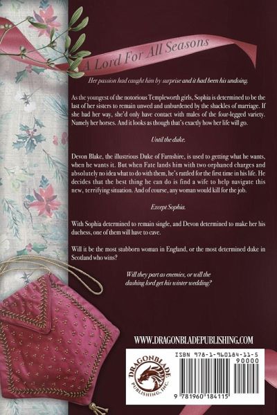 Her passion had caught him by surprise and it had been his undoing. As the youngest of the notorious Templeworth girls, Sophia is determined to be the last of her sisters to remain unwed and unburdened by the shackles of marriage. If she had her way, she'd only have contact with males of the four-legged variety. Namely her horses. And it looks as though that's exactly how her life will go. Until the duke. Devon Blake, the illustrious Duke of Farnshire, is used to getting what he wants, when he wants it. But when Fate lands him with two orphaned charges and absolutely no idea what to do with them, he's rattled for the first time in his life. He decides that the best thing he can do is find a wife to help navigate this new, terrifying situation. And of course, any woman would kill for the job. Except Sophia. With Sophia determined to remain single, and Devon determined to make her his duchess, one of them will have to cave. Will it be the most stubborn woman in England, or the most determined duke in Scotland who wins? Will they part as enemies, or will the dashing lord get his winter wedding? A Lord for All Seasons A Springtime Scandal Midsummer Madness A Forgotten Fall A Winter Wedding