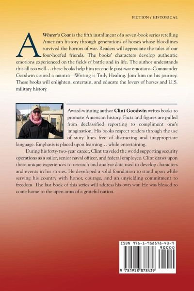 A Winter's Coat examines lives of two mares are put at center stage during the Korean War. One, transported weapons for the U.S. Marine Corps on the Korean Peninsula. The second, anxiously awaited stateside for her owner to return. Both horses are touched by an impassioned veterinarian whose family's proud military service dates back to the U.S. Civil War. Will Doctor Robert Bates' hands keep the chain from breaking? A Winter's Coat is the fifth installment of a seven-book series retelling American history through generations of horses whose bloodlines survived the horrors of war. Readers will appreciate the tales of our four-hoofed friends. The books' characters develop authentic emotions experienced on the fields of battle and in life. The author understands this all too well... these books help him reconcile post-war emotions. Commander Goodwin coined a mantra-Writing is Truly Healing. Join him on his journey. These books will enlighten, entertain, and educate the lovers of horses and U.S. military history.