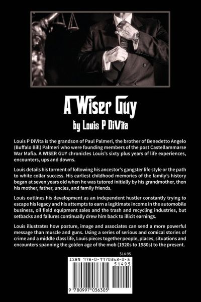 Louis P DiVita is the grandson of Paul Palmeri, the brother of Benedetto Angelo (Buffalo Bill) Palmeri who were founding members of the post Castellammarse War Mafia. A WISER GUY chronicles Louis's sixty plus years of life experiences, encounters, ups and downs. Louis details his torment of following his ancestor's gangster life style or the path to white collar success. His earliest childhood memories of the family's history began at seven years old when he was tutored initially by his grandmother, then his mother, father, uncles, and family friends. Louis outlines his development as an independent hustler constantly trying to escape his legacy and his attempts to earn a legitimate income in the automobile business, oil field equipment sales and the trash and recycling industries, but setbacks and failures continually drew him back to illicit earnings. Louis illustrates how posture, image and associates can send a more powerful message than muscle and guns. Using a series of serious and comical stories of crime and a middle class life, Louis pieces together people, places, situations and encounters spanning the golden age of the mob (1920s to 1980s) to the present.