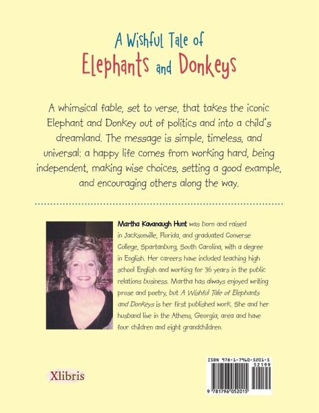 A whimsical fable, set to verse, that takes the iconic Elephant and Donkey out of politics and into a child's dreamland. The message is simple, timeless, and universal: a happy life comes from working hard, being independent, making wise choices, setting a good example, and encouraging others along the way.