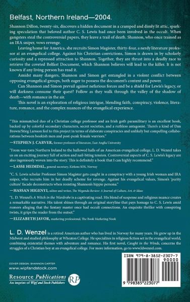 Belfast, Northern Ireland--2004. Shannon Dillon, twenty-six, discovers a hidden document in a cramped and dimly lit attic, sparking speculation that beloved author C. S. Lewis had once been involved in the occult. When gangsters steal the controversial papers, they leave a trail of death. Shannon, who once trained as an IRA sniper, vows revenge. Leaving home for America, she recruits Simon Magister, thirty-four, a nerdy literature professor at an evangelical college. Against his Christian convictions, Simon is drawn in by scholarly curiosity and a repressed attraction to Shannon. Together, they are thrust into a deadly race to retrieve the coveted Belfast Document, which Shannon believes will lead to the killer. It is not known if any living person has read it. Amidst many dangers, Shannon and Simon get entangled in a violent conflict between opposing evangelical groups, both eager to possess the document's content and power. Can Shannon and Simon prevail against nefarious forces, or will darkness consume their quest? Follow as they walk through the valley of the shadow of death--with romance in the air. This novel is an exploration of religious intrigue, blending faith, conspiracy, violence, literature, romance, and the complex nuances of the evangelical experience.