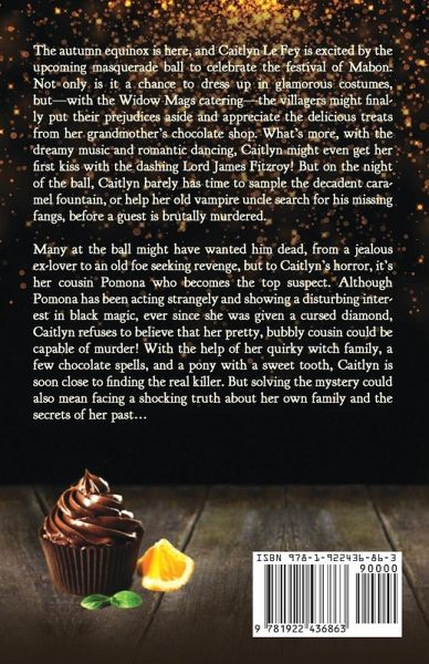 Caitlyn Le Fey is savouring the delights of autumn with hot spiced cider and rich toffee apples, as she helps with preparations for the upcoming Samhain Festival. She's also looking forward to spending more time with the dashing Lord James Fitzroy and meeting his family at last. But the cosy atmosphere is shattered when a guest at Huntingdon Manor is found dead, murdered for an ancient grimoire that once belonged to the Widow Mags. Determined to solve the mystery and retrieve the stolen "book of spells", Caitlyn sets out to do some witchy sleuthing and soon discovers that there are many who may have wanted the grimoire: from the glamorous friends of James's sister to a mysterious retired academic-who might just be her long-lost mother in disguise! Tensions are rising in the village, however, as superstitions spread and hostility grows towards the Widow Mags's chocolate shop. And just when Caitlyn thinks things can't get any worse, clues start pointing to James's sister as the killer... With the help of her toothless vampire uncle Viktor and her mischievous kitten Nibs (not to mention a sprinkle of chocolate magic!) - can Caitlyn find the missing grimoire and finally uncover the truth about her mother?